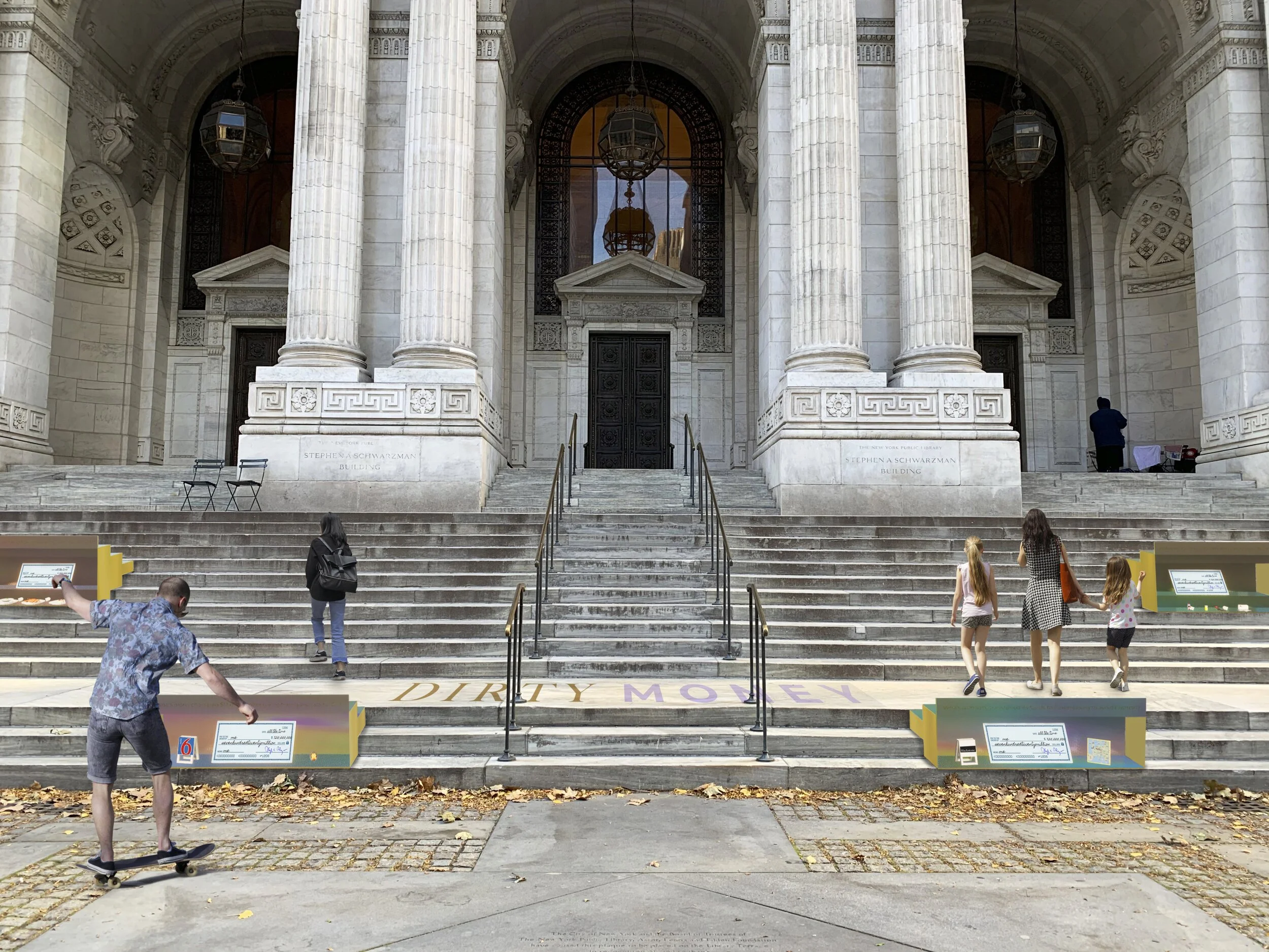 Graphic elements are based on the materiality of the exhibition. Some subway benches are wrapped in gold, with a provocative question about the subway system written in holographic letters, along with the library logo. One of the Times Square screens televises a compelling question about Times Square in holographic letters on a gold background, along with the library logo, inviting potential visitors to the venue.