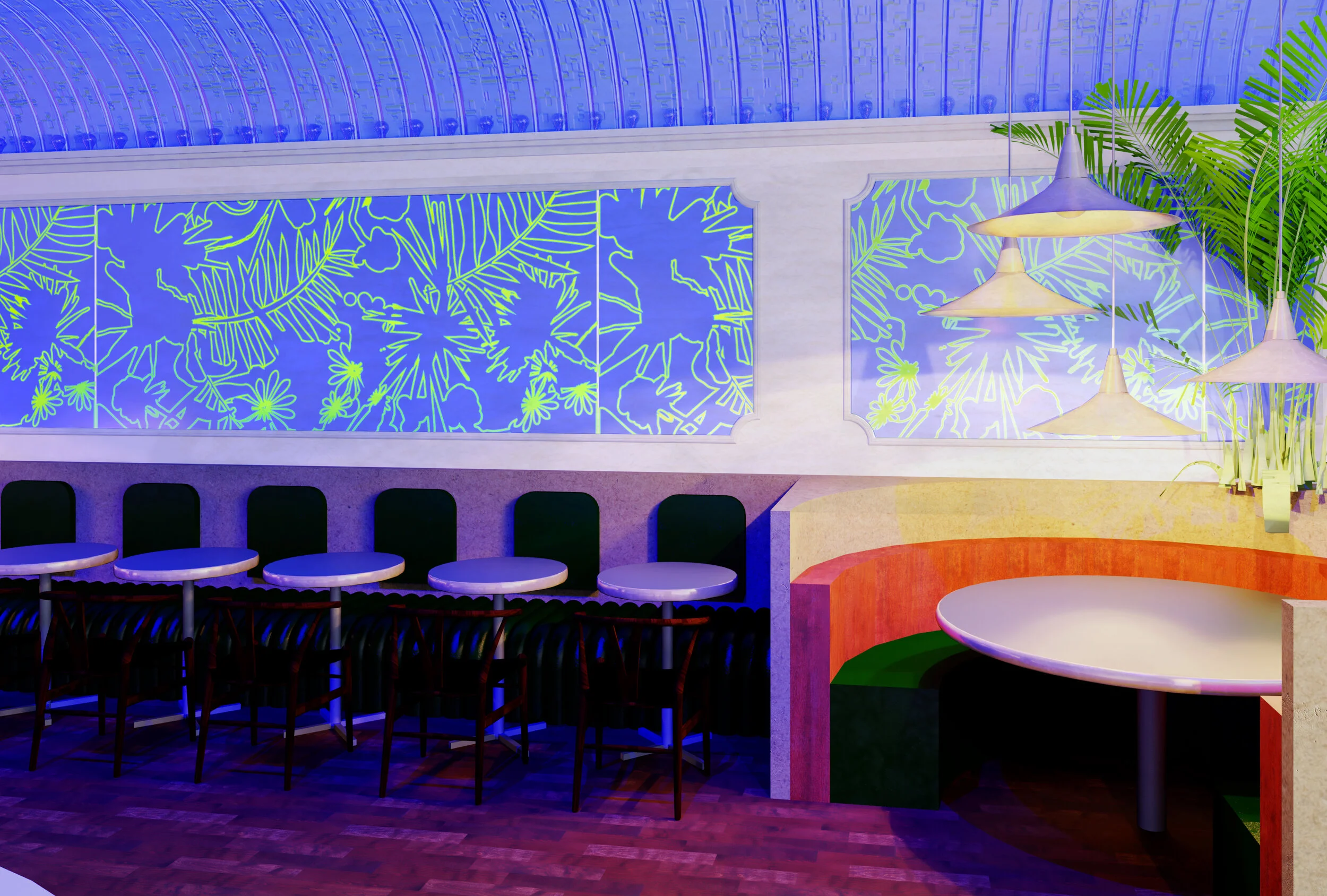 This project is a lighting design proposal that depicts two different scenarios for a cafe. Blacklight can be immensely useful in creating different experiences. Jungle is a cafe that is bright, open, and inviting during the day. The glass facade lets the daylight in, which travels through the vaulted ceiling into the environment. During the night-time, the lighting turns into a blue/magenta, which activated the wall patterns. The only visible colors become saturated blues and neon greens. The environment changes to a place of enigma and mystery.